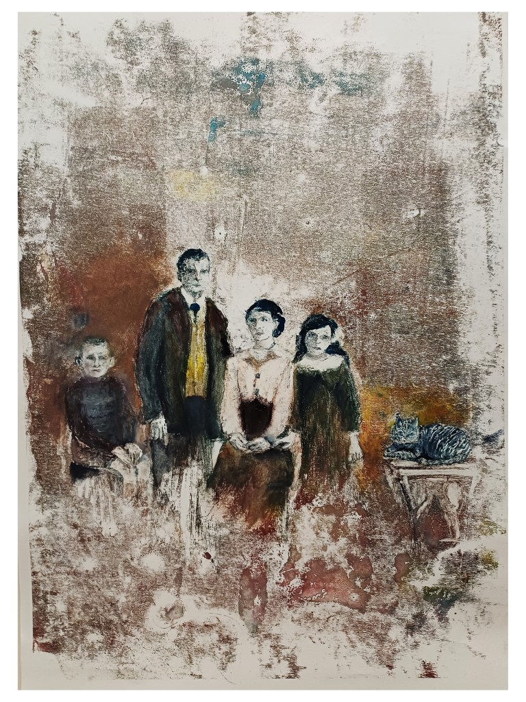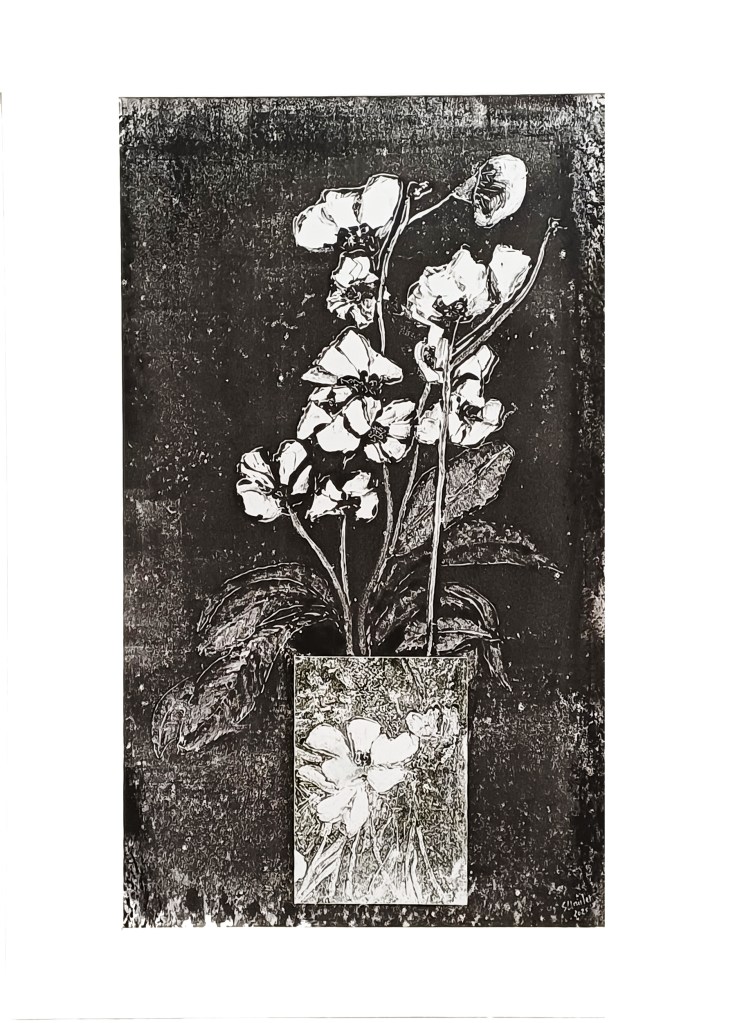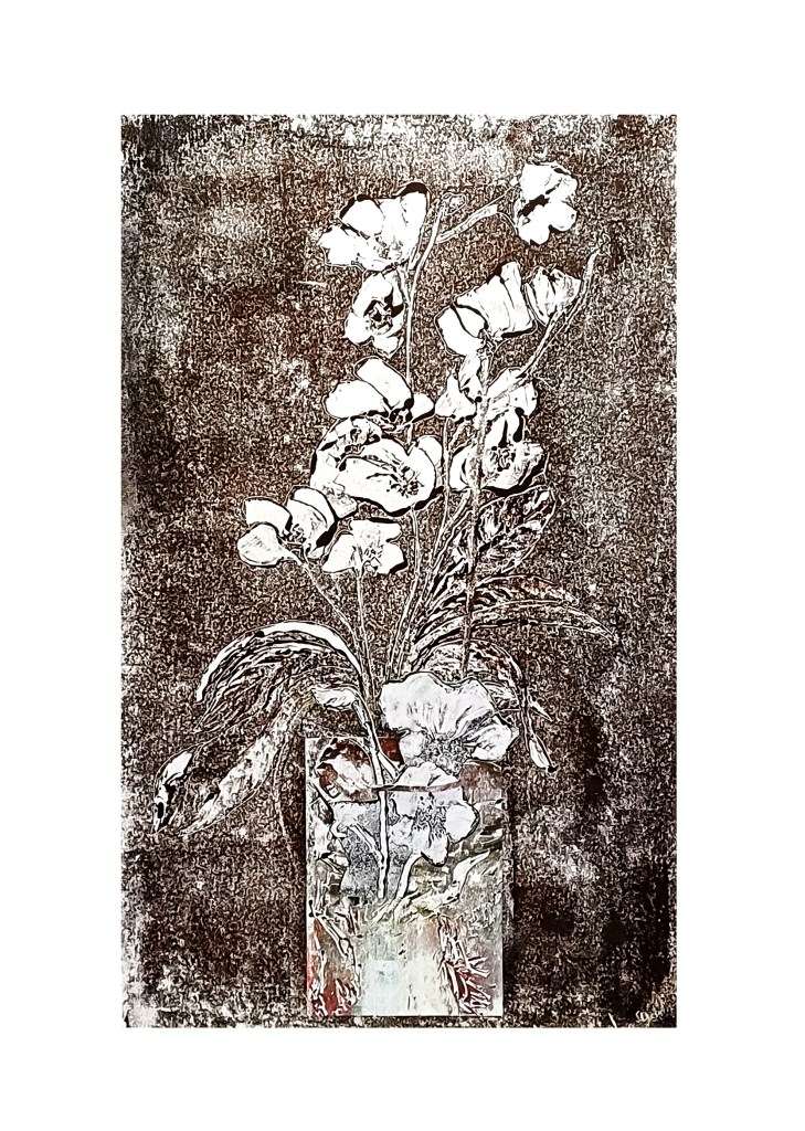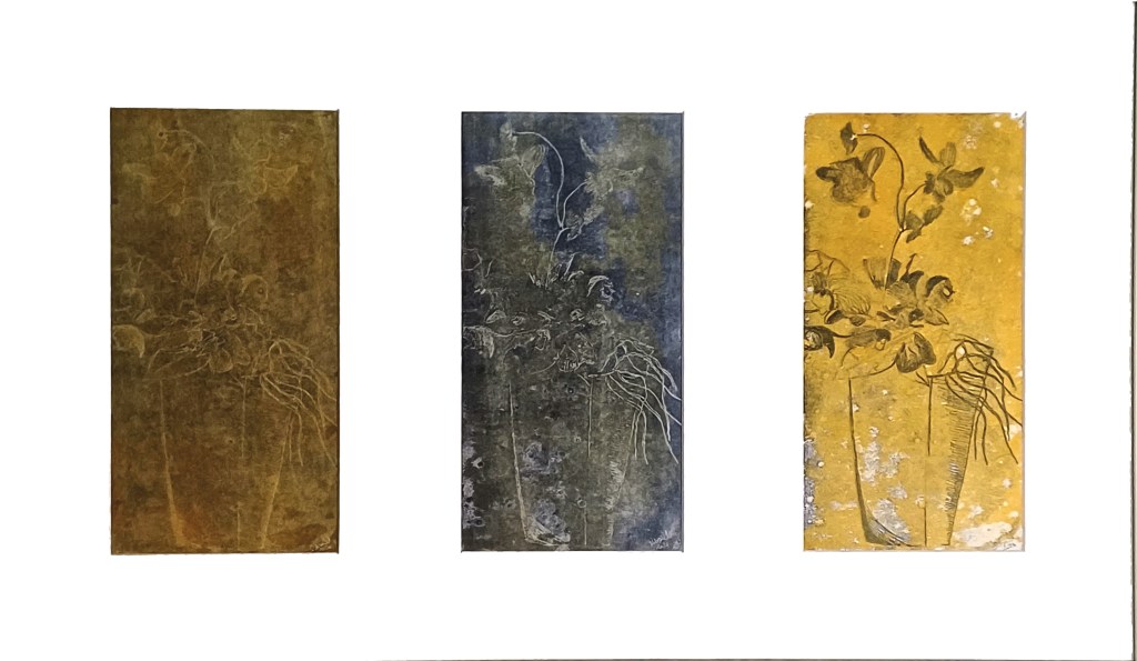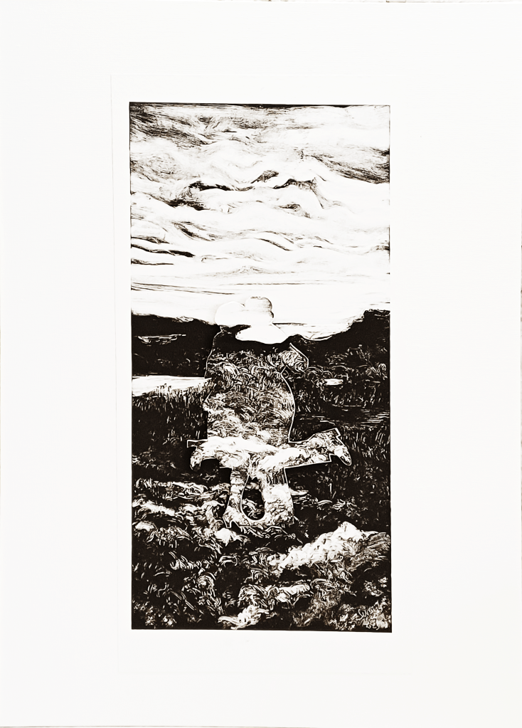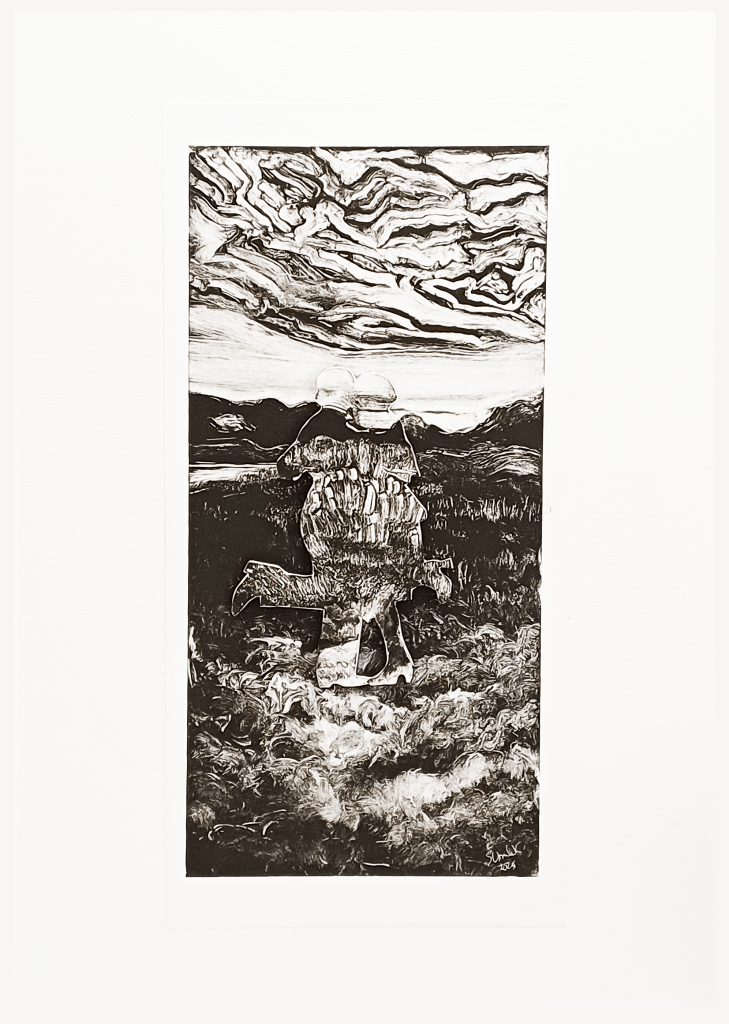 Initiée depuis peu au monotype et à la linogravure, j’explore la trace : l’encre pressée, ses nuances, ses accidents heureux.